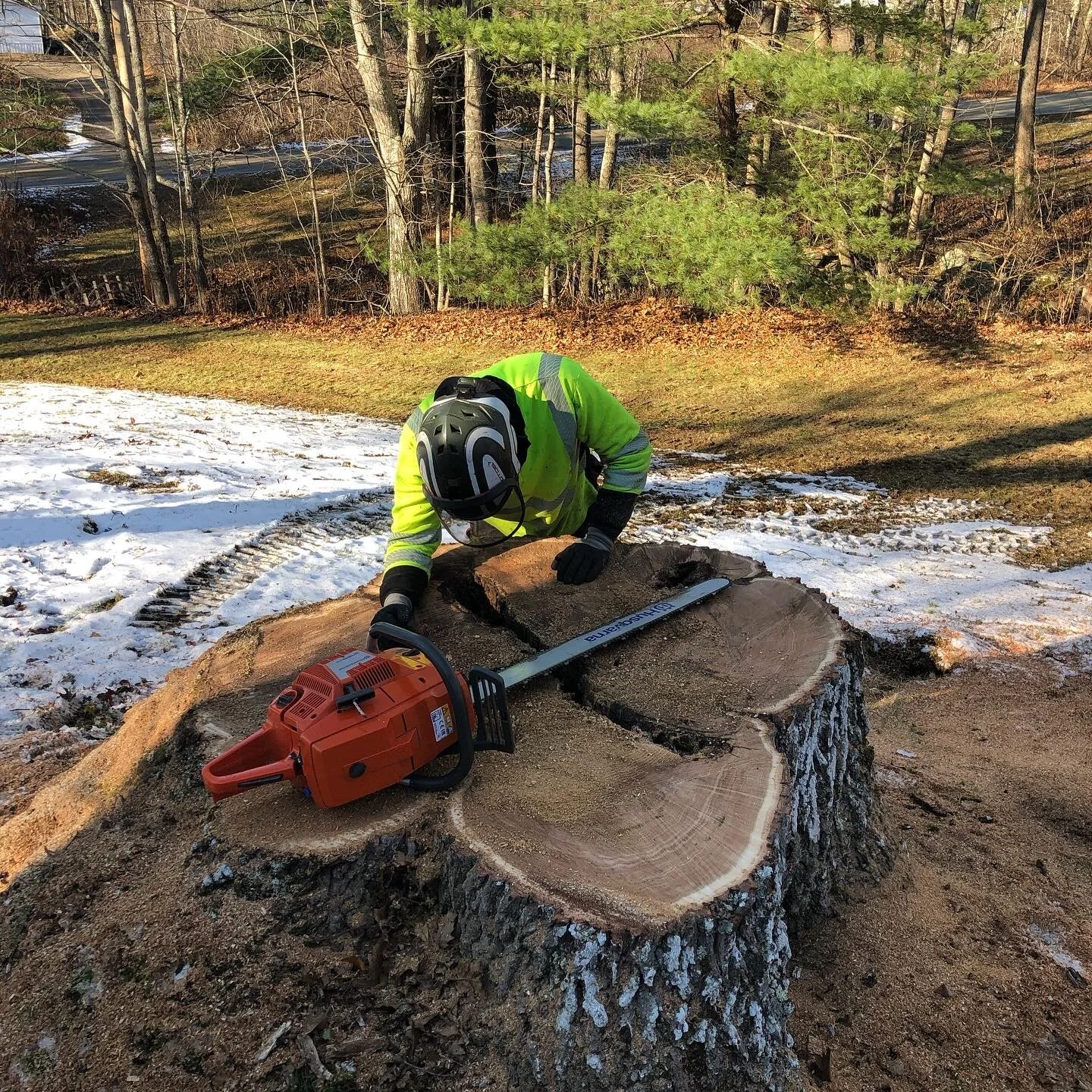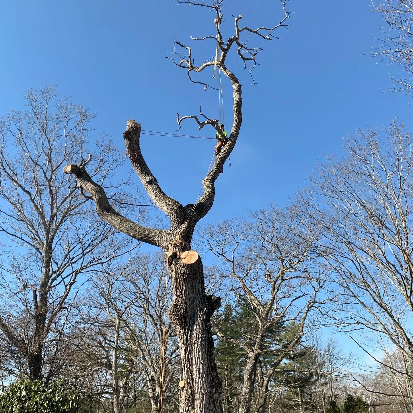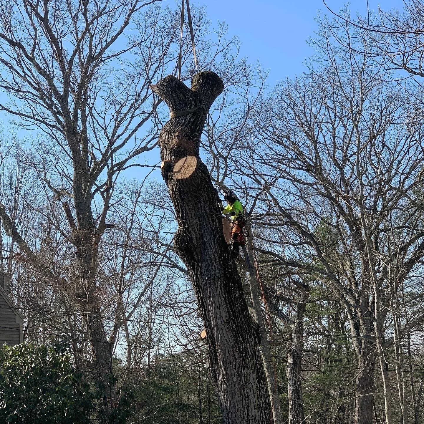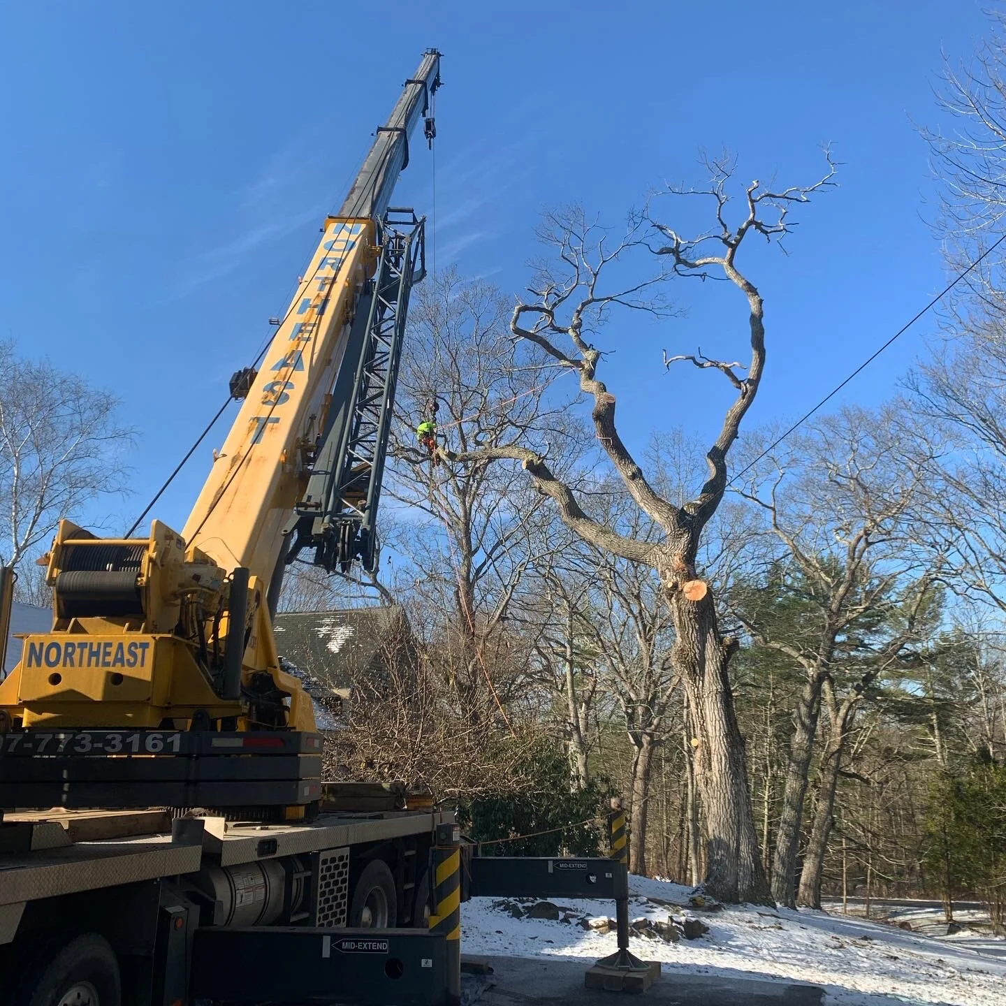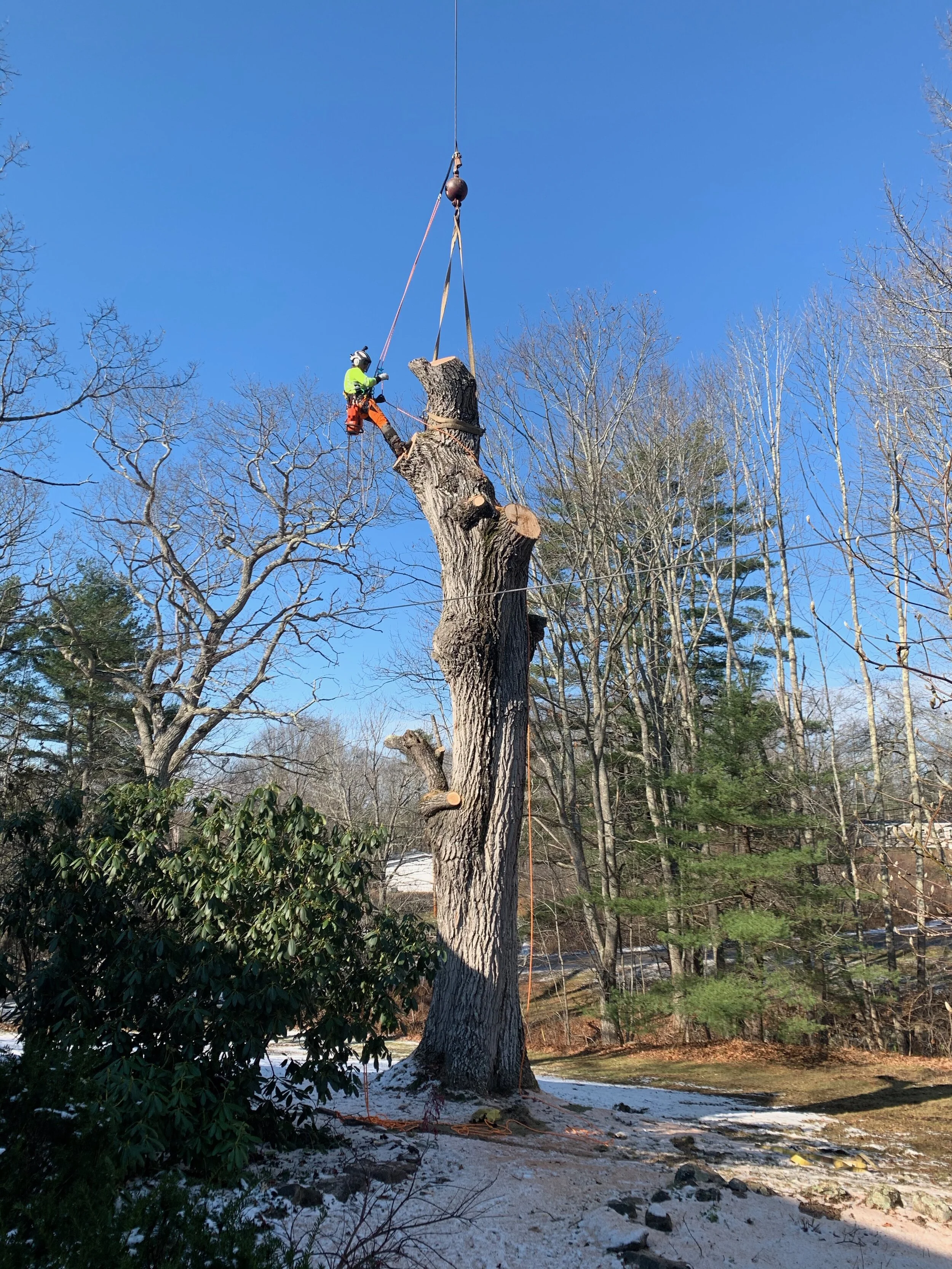Here, we are taking down a large and hazardous oak with the assistance of a 60 ton crane. We elected to call in the crane to move the material over the yard without causing any damage. The pieces of trunk wood weighed an average of 6,000 lbs! The tree exhibited serious dieback in the crown, visible cracking along the trunk, and had a significant lean toward the house. We worked in collaboration with Dirigo Tree Service of Freeport and our favorite crane operator to safely remove over 40,000 lbs of material with almost no impact on the lawn and gardens below.